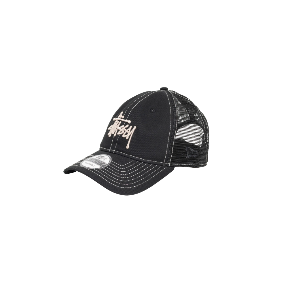 Um boné trucker clássico da Stussy x New Era na cor preta, com painéis em mesh ventilados, aba curva e coroa desestruturada para um visual descontraído e confortável. Possui o logo bordado da Stussy na frente e fechamento strapback ajustável, ideal para looks casuais e estilo streetwear atemporal.