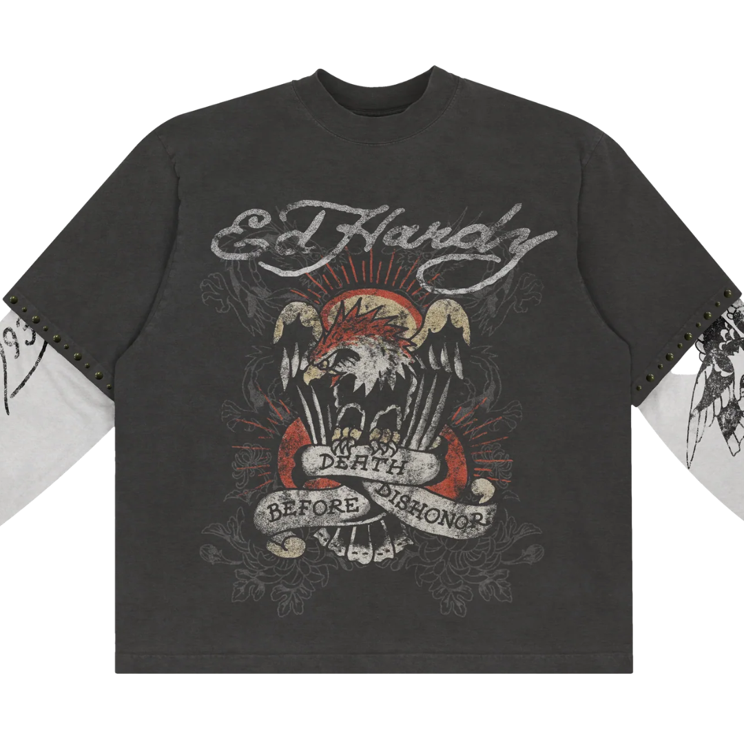 Camiseta Manga Longa Ed Hardy x Matue Death Before Dishonor "Grey" Cinza Estonado, disponível na Cop Club.