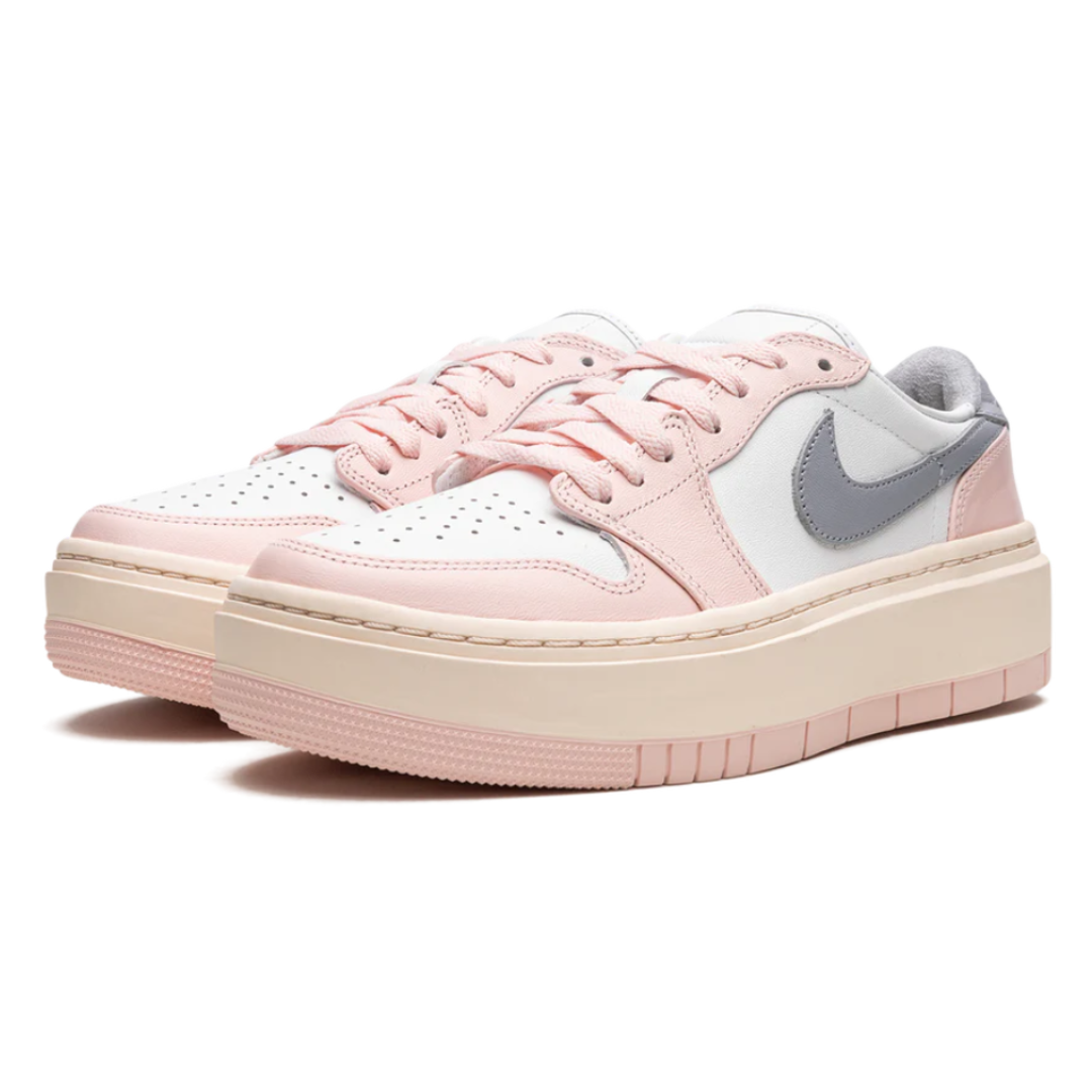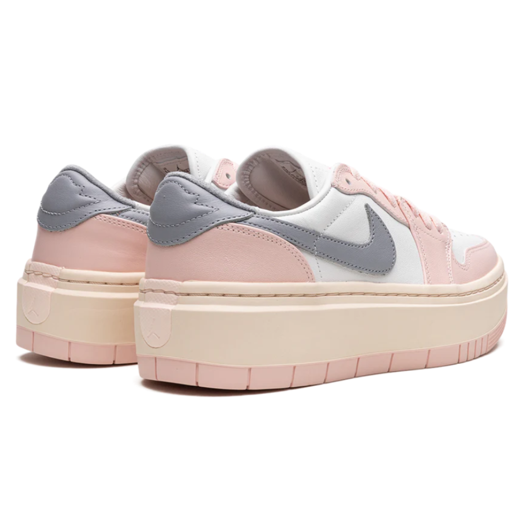 O Air Jordan 1 Elevate Low "Atmosphere" feminino é uma versão exclusiva feminina do tênis de basquete retrô com um design atualizado que inclui uma sola estilo plataforma. O Jordan 1 Elevate Low dá um toque contemporâneo ao Jordan 1 Low com uma sola de borracha branca oversized, que adiciona uma altura significativa ao usuário. Apesar de seu estilo modernizado, o resto do tênis permanece um pouco consistente com o modelo Jordan 1 Low OG. O sapato apresenta uma base de couro branco com sobreposições de couro rosa. Um Swoosh de couro cinza aparece no painel central. Um logotipo "Asas" estilo bolha aparece no calcanhar.