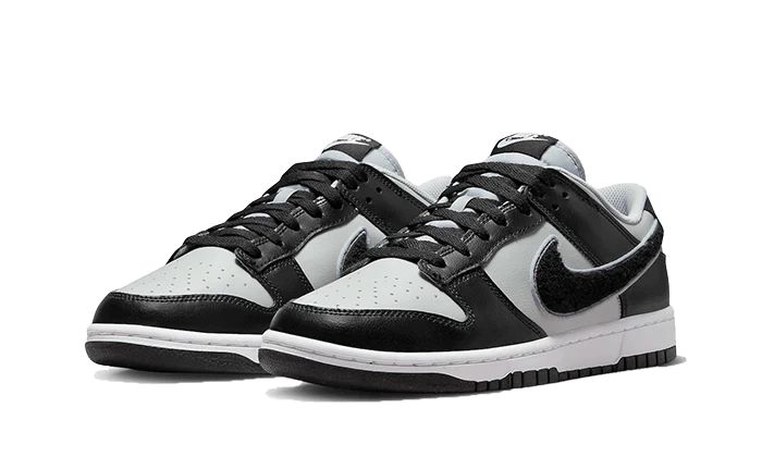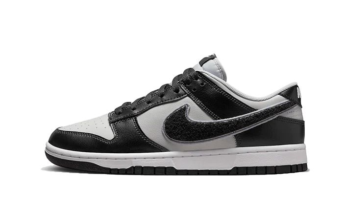 Tênis Dunk Low "Chenille Swoosh" Preto/Cinza, disponível na Cop Club.