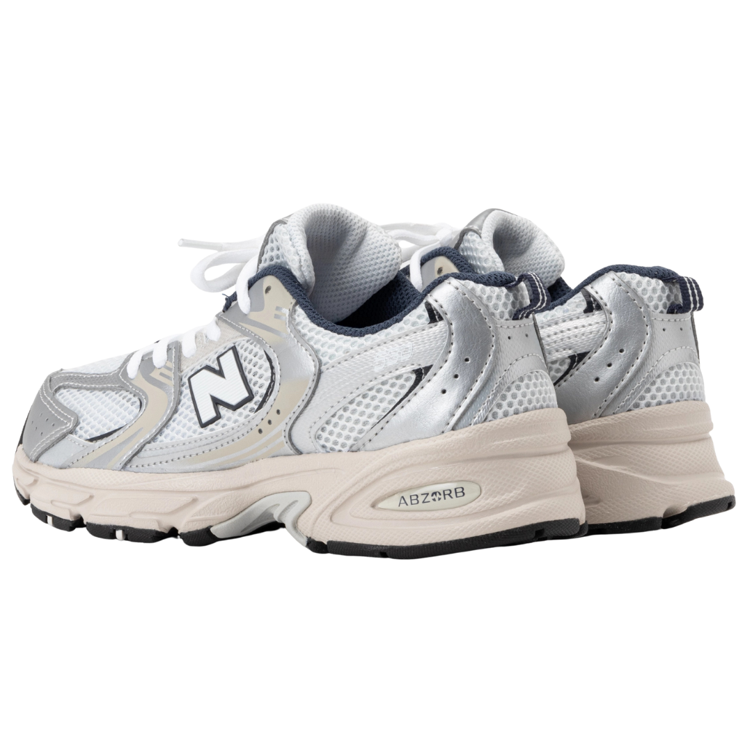 Tênis New Balance 530 "GS Summer Fog Navy" Branco/Prata, disponível na Cop Club.