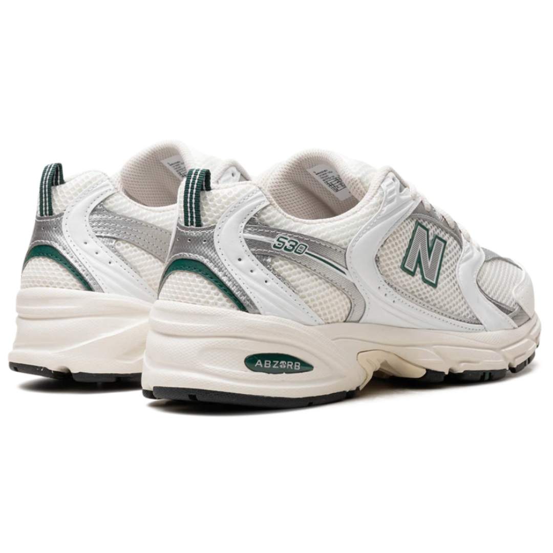 Tênis New Balance 530 "Sea Salt Marsh Green" Branco/Verde, disponível na Cop Club.