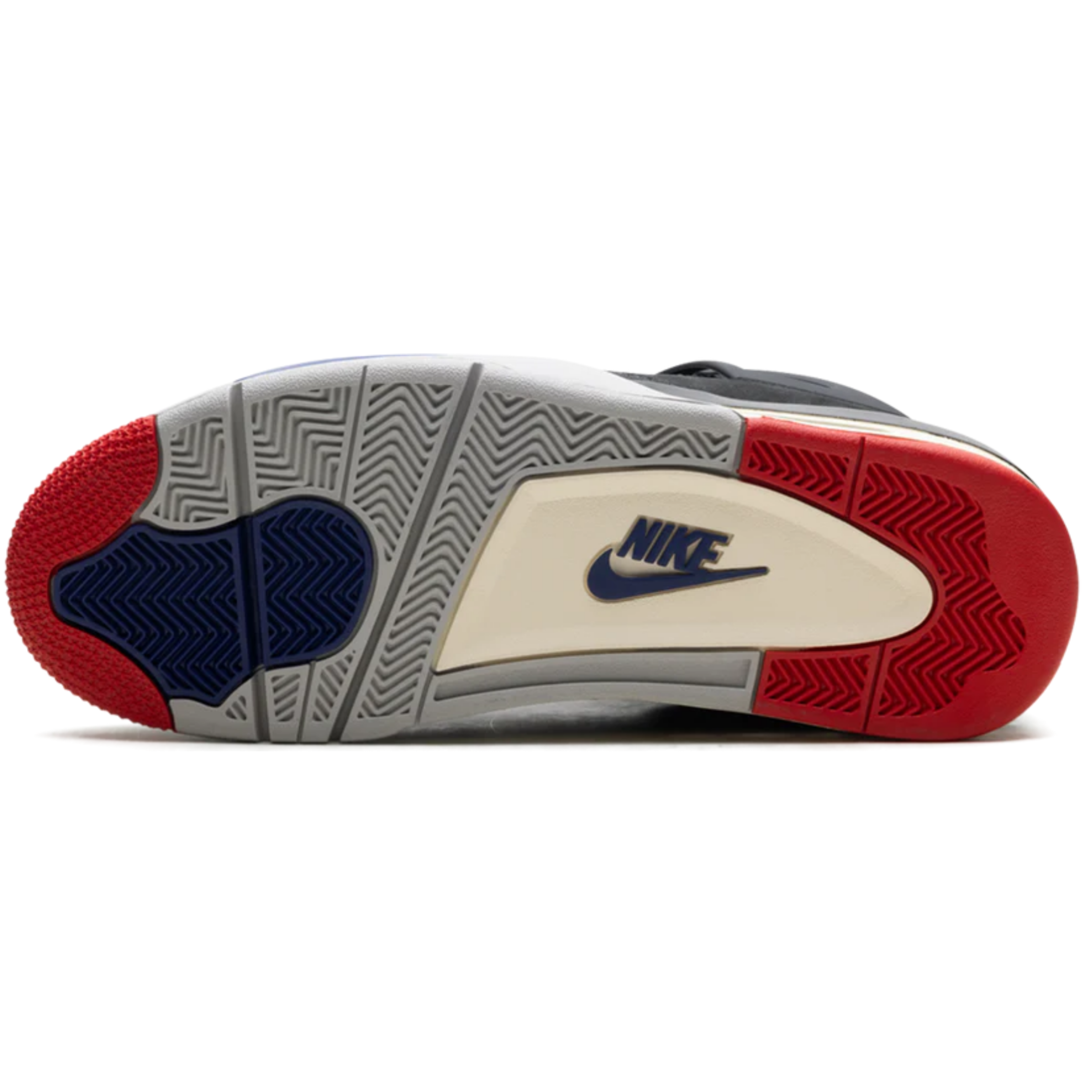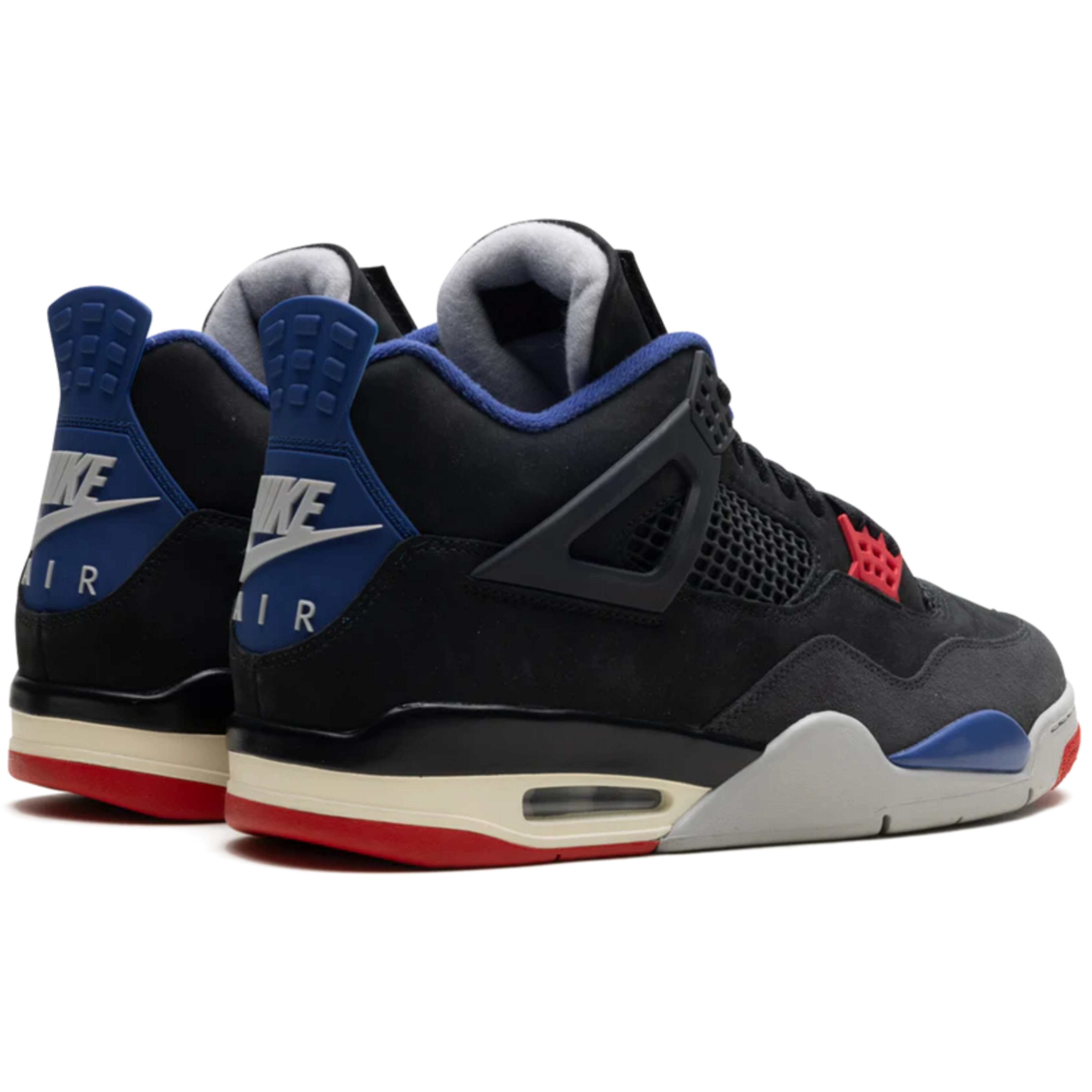 O Jordan 4 “Rare Air” White Lettering é uma versão diferenciada do clássico AJ4, com cabedal em nubuck preto e painéis de mesh nas laterais. Ele traz detalhes estruturais como as asas de sustentação em TPU e ilhoses moldados em preto e vermelho (“Fire Red”) para um contraste ousado. Sobre o antepé, uma sobreposição de suede cinza escuro reforça o design, com costuras brancas destacando as linhas. O colarinho interno é revestido em um tecido azul royal, que também aparece na aba do calcanhar com a marca Nike Air. Um dos destaques é a língua com patches de velcro intercambiáveis — permitindo personalização —, além da inscrição “Rare Air” na palmilha. A entressola de espuma com unidade Air visível combina conforto e amortecimento, com um toque de azul royal e preto no calcanhar para finalizar o visual.