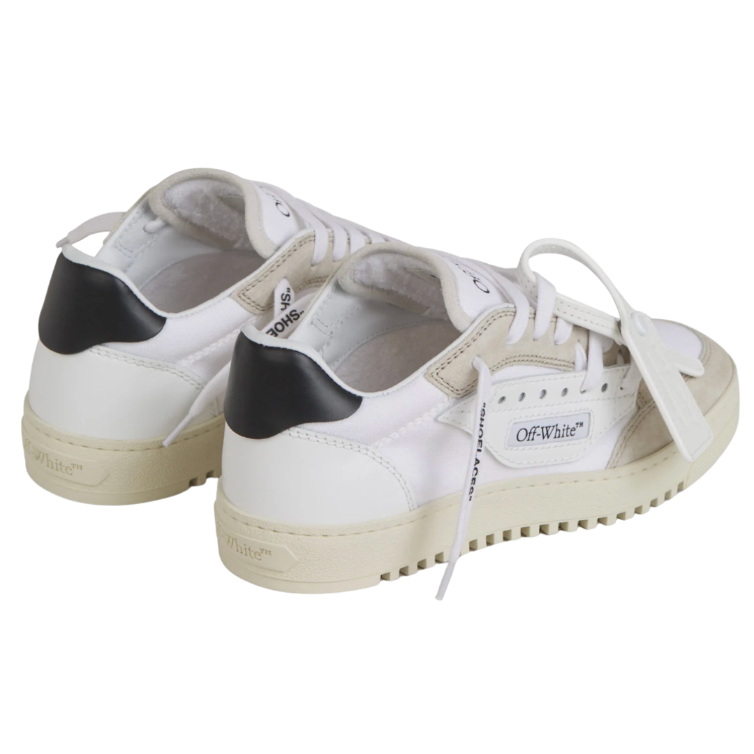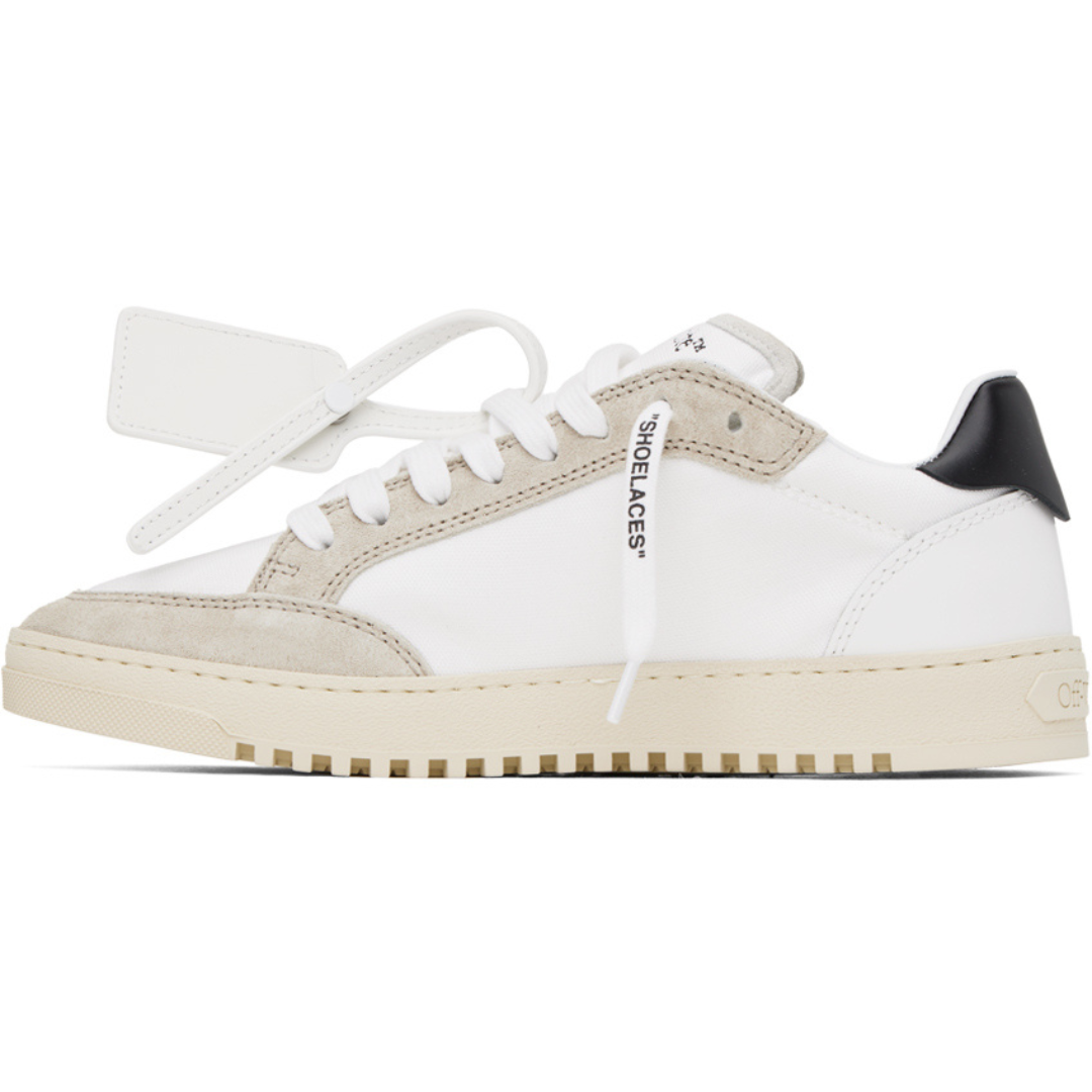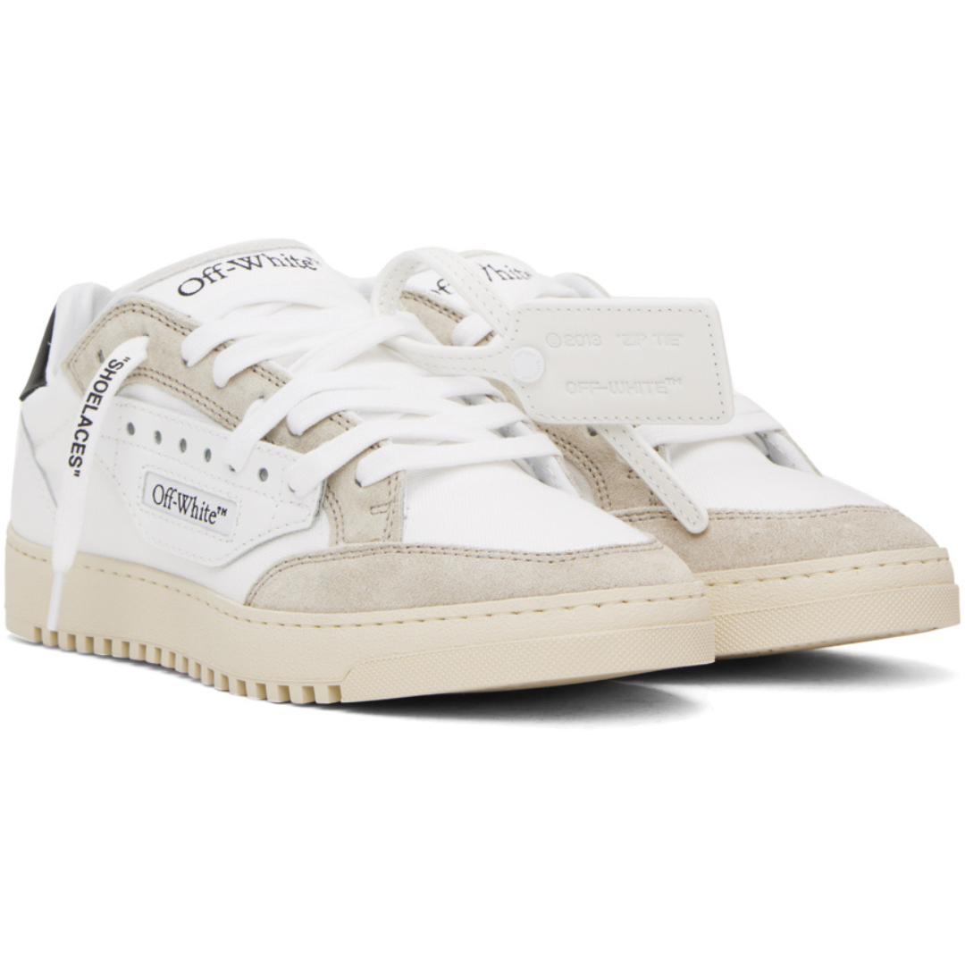O icônico símbolo de setas ("Arrows") bordado na lateral, reforçando a identidade da marca, enquanto a etiqueta "Zip Tie" anexada, uma assinatura reconhecível dos produtos Off-White. Cadarços com a inscrição "SHOELACES", adicionando um toque de ironia e estilo característico. O Off-White 5.0 Off Court exemplifica a habilidade da Off-White em mesclar elementos do streetwear com o luxo, resultando em um tênis que é tanto uma declaração de moda quanto uma peça funcional para o uso diário..